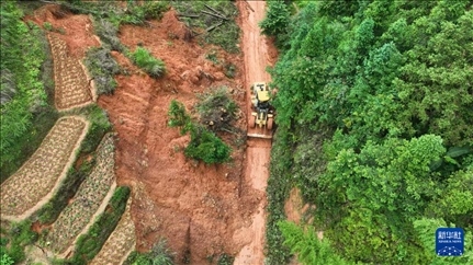 6月18日,工作人員駕駛機械在貴州省黔東南苗族侗族自治州錦屏縣鐘靈鄉(xiāng)清理進(jìn)村道路(無人機照片)。