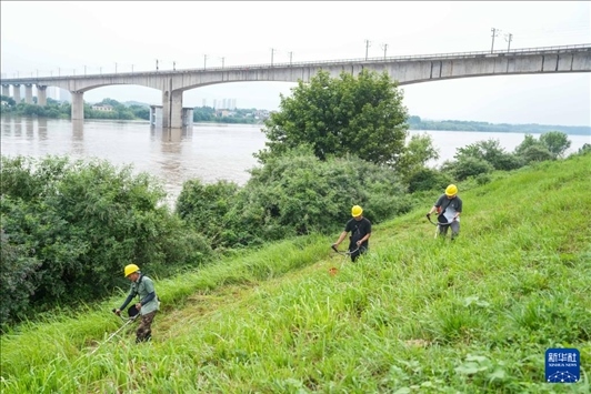 6月18日,長沙市天心區(qū)湘江堤岸,南托垸水利管理站工作人員在進(jìn)行砍青除雜工作,確保河水清暢。