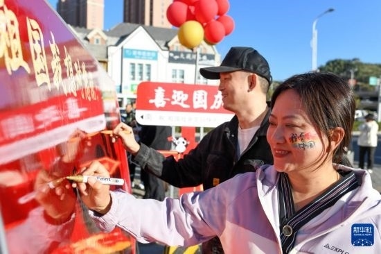 9月29日,烏魯木齊市水磨溝區(qū)水磨溝街道北山社區(qū)居民在心愿墻上寫下對祖國的祝福。