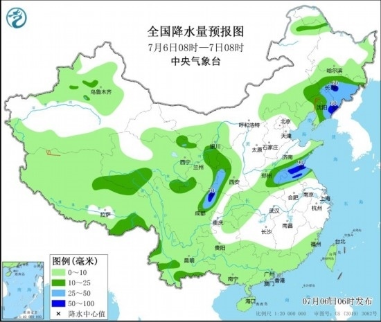 預(yù)計(jì),7月6日08時(shí)至7日08時(shí),吉林中東部、遼寧東部、陜西南部、山東南部、河南東部、安徽北部、江蘇北部、四川盆地西北部等地部分地區(qū)有大雨,其中,吉林中東部、遼寧東部、山東南部、江蘇北部、四川盆地西北部等地部分地區(qū)有暴雨(50~90毫米)。上述部分地區(qū)伴有短時(shí)強(qiáng)降水(最大小時(shí)降雨量20~50毫米,局地可超過(guò)60毫米);吉林東部、遼寧東部、山東南部、河南東部、安徽北部、江蘇北部等地的部分地區(qū)將有8-10級(jí)雷暴大風(fēng)或冰雹天氣。中央氣象臺(tái)7月6日06時(shí)發(fā)布暴雨藍(lán)色預(yù)警和強(qiáng)對(duì)流天氣藍(lán)色預(yù)警。