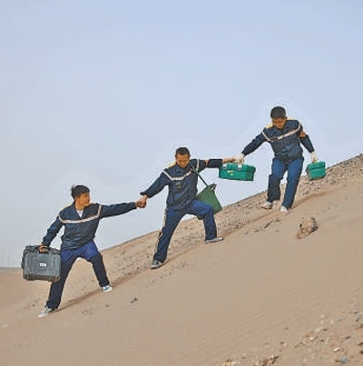 “今天這一路,算順利的。”臺(tái)欣龍說,“假如某個(gè)檢測(cè)站發(fā)出故障警報(bào),無論什么天氣,都必須立即響應(yīng)?!痹诹_布泊,沙塵暴說來就來,一刮就是三四個(gè)小時(shí)。有一回,他們遇上特大沙塵暴,風(fēng)暴像堵墻一樣迎面撲來。越野車迎風(fēng)的一側(cè),車漆幾乎全被風(fēng)沙打掉?!靶姨澑浇凶鶚蚝蠡飪涸诶镱^躲了3個(gè)多小時(shí)?!憋L(fēng)暴過后,衣服上、頭發(fā)上、耳朵里、鼻孔里全都是沙子。一抬腳,鐵道路基上的風(fēng)沙已沒過膝蓋。