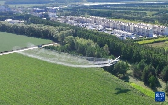 8月2日,農(nóng)用飛機(jī)在北大荒集團(tuán)黑龍江尖山農(nóng)場有限公司農(nóng)業(yè)科技服務(wù)中心玉米田噴施葉面肥(無人機(jī)照片)。