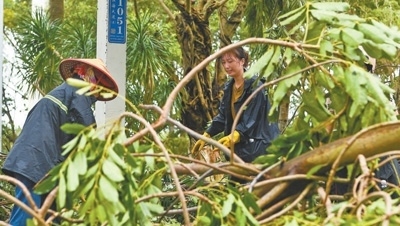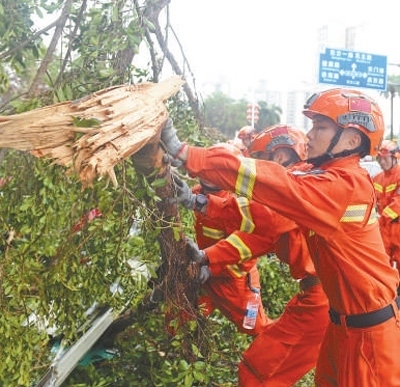 9月7日,海南省海口市工作人員在??谑袨I海大道上清理被風(fēng)吹倒的樹(shù)木。新華社記者 楊冠宇攝