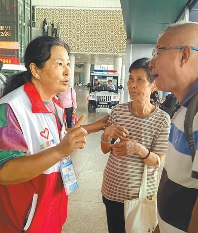 廣州南站的每個(gè)角落唐偉都了然于心。她已經(jīng)在這里服務(wù)超過13個(gè)年頭,是志愿服務(wù)隊(duì)里年紀(jì)最大的一名“銀發(fā)”志愿者,人們親切地稱呼她為“唐姨”。