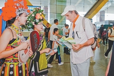 在云南昆明長(zhǎng)水國(guó)際機(jī)場(chǎng)舉行的南華野生菌推介活動(dòng)上,工作人員向外國(guó)友人介紹野生菌產(chǎn)品。南華縣委宣傳部供圖
