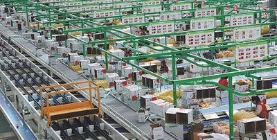 陜西洛川縣一家果業(yè)企業(yè)的蘋果包裝生產(chǎn)線,工作人員正在進(jìn)行包裝作業(yè)。李 進(jìn)攝
