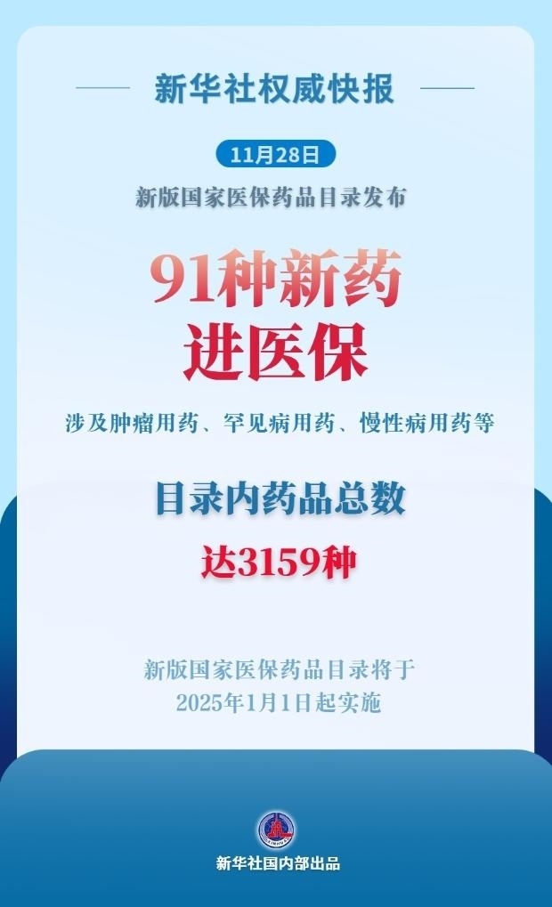 國(guó)家醫(yī)保局11月28日召開(kāi)新聞發(fā)布會(huì),發(fā)布新版國(guó)家醫(yī)保藥品目錄調(diào)整情況。本次調(diào)整共新增91種藥品,包括腫瘤用藥、糖尿病等慢性病用藥、罕見(jiàn)病用藥、抗感染用藥、中成藥、精神病用藥等。同時(shí),調(diào)出43種臨床已替代或長(zhǎng)期未生產(chǎn)供應(yīng)的藥品。