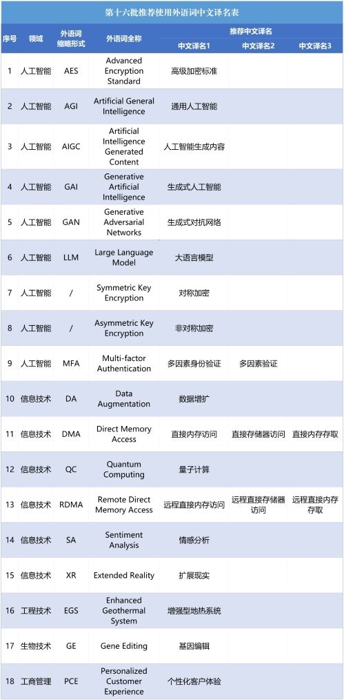 記者12月10日從教育部獲悉,近日,外語(yǔ)中文譯寫規(guī)范部際聯(lián)席會(huì)議專家委員會(huì)審議通過(guò)第十六批18組推薦使用外語(yǔ)詞中文譯名。本次擬推薦使用的外語(yǔ)詞中文譯名,均為與人工智能、信息技術(shù)等相關(guān)的詞條。