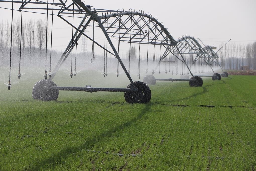 圖為種糧大戶使用自動噴灌設(shè)備給麥田澆水。(張靜 攝)