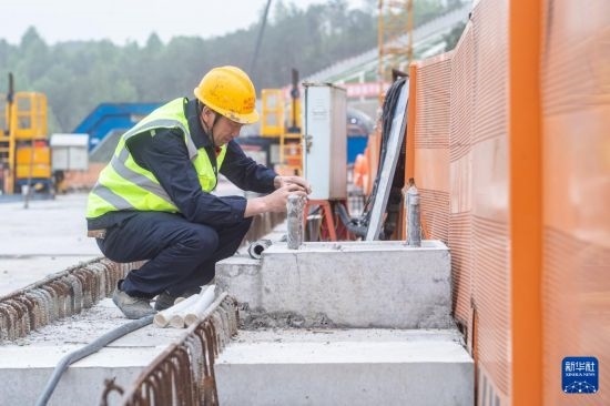 4月12日,工人在成渝中線高鐵玄天湖雙線大橋建設(shè)現(xiàn)場(chǎng)施工作業(yè)。