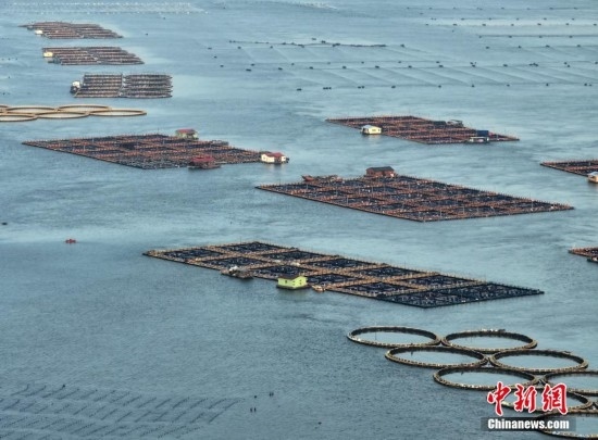5月2日,福建福州福清市沙埔鎮(zhèn)養(yǎng)殖海域,養(yǎng)殖網箱漂浮在海面上,海上風車依次排開,蔚為壯觀。(無人機照片)
