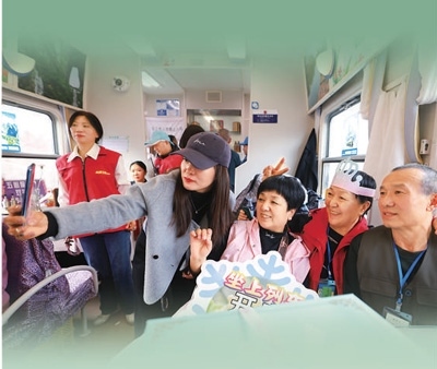 為讓銀發(fā)旅游更加精彩,銀發(fā)旅游列車不僅注重適老化改造,還通過(guò)特色主題表演,為老年游客帶來(lái)豐富的旅行體驗(yàn)。在Y471次熊貓旅游專列上,游客們可以欣賞到別具特色的川劇變臉。在黑龍江的冰雪旅拍主題旅游列車上,車廂內(nèi)融合哈爾濱各類景點(diǎn)進(jìn)行主題場(chǎng)景設(shè)計(jì),老年游客只需掃碼預(yù)約便可換上不同風(fēng)格的服裝在車廂內(nèi)拍照打卡。列車上,老年游客不僅樂(lè)趣十足,還留下許多美好回憶。
