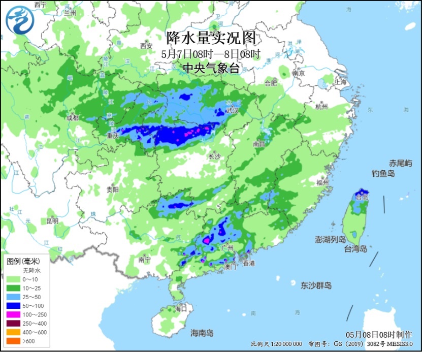 氣象監(jiān)測(cè)顯示,昨日,重慶東部、湖北西南部、湖南西北部、廣西東北部、廣東中西部及臺(tái)灣島北部等地部分地區(qū)出現(xiàn)大到暴雨,重慶彭水、湖北恩施、湖南張家界、廣東肇慶和江門等局地大暴雨(100~192毫米)。
