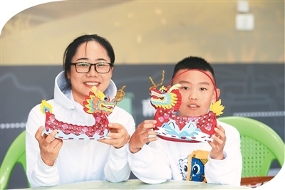 在青海省西寧市博物館舉辦的端午節(jié)主題活動中,家長和小朋友展示制作的龍舟擺件。