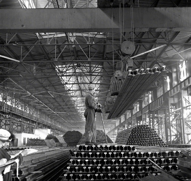 “一五”期間,鞍鋼興建的第一座大型軋鋼廠生產(chǎn)能力已迅速超過設(shè)計(jì)標(biāo)準(zhǔn)。這是這個(gè)廠生產(chǎn)的大批鋼軌(攝于1957年4月)。