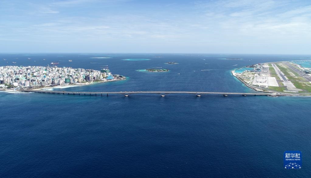 這是2019年8月30日在馬爾代夫航拍的連接首都馬累和機(jī)場島的中馬友誼大橋。新華社發(fā)(王明亮攝)