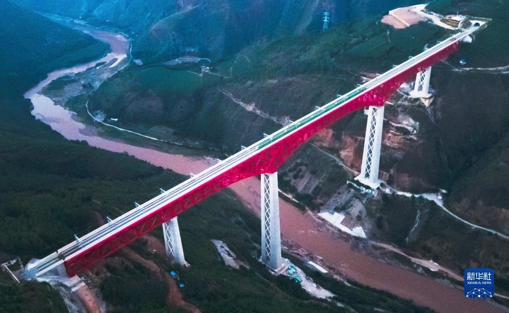 中老鐵路首發(fā)列車駛過中國云南省元江哈尼族彝族傣族自治縣境內(nèi)的元江雙線特大橋(2021年12月3日攝,無人機(jī)照片)。新華社記者 王冠森 攝