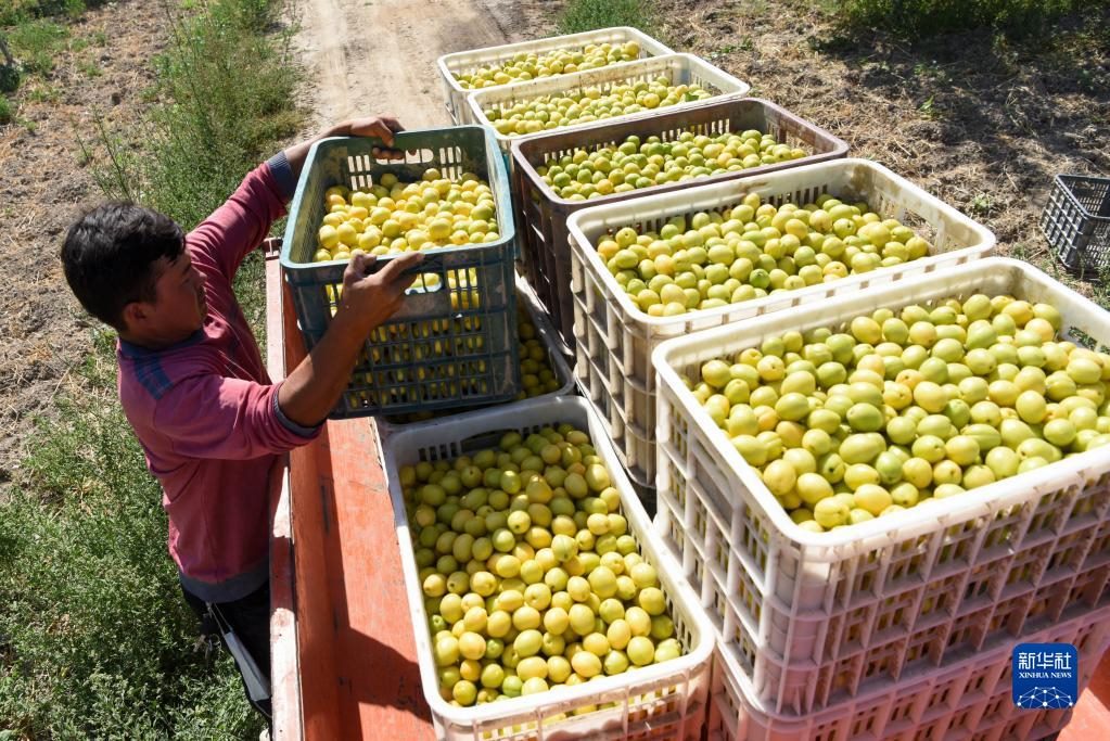 在新疆阿克蘇地區(qū)庫(kù)車市齊滿鎮(zhèn)齊滿村,農(nóng)戶將采摘的小白杏裝車(2021年7月1日攝)。新華社記者 丁磊 攝