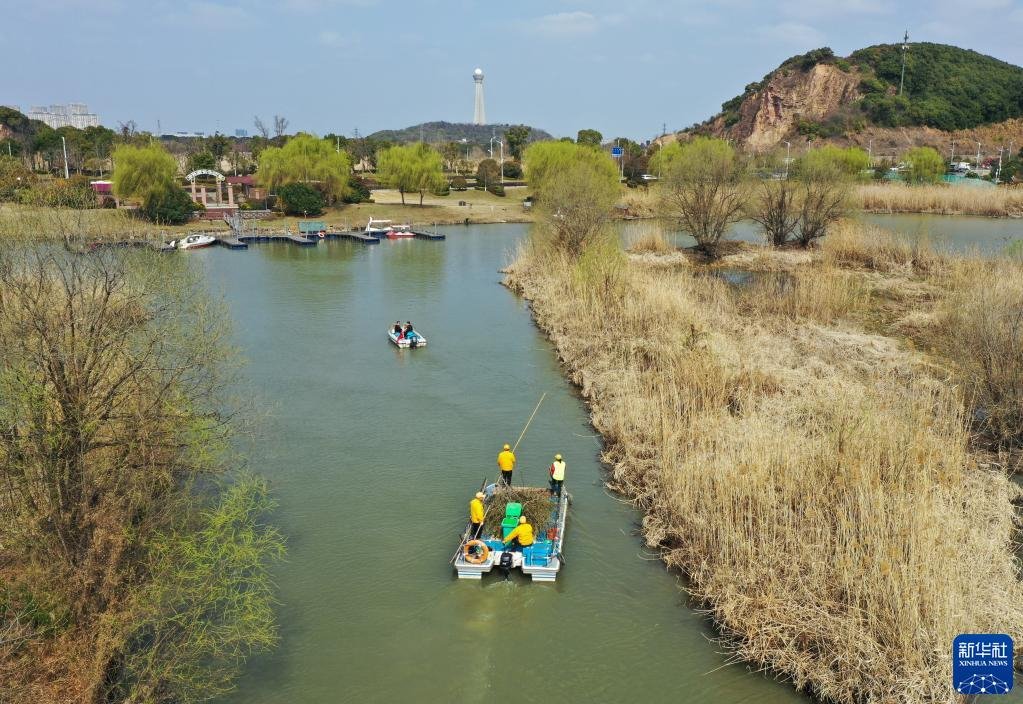 浙江省湖州市吳興區(qū)八里店鎮(zhèn)移沿山村河長(zhǎng)帶隊(duì)在移沿山村開(kāi)展巡河、保潔作業(yè)(2021年2月24日攝,無(wú)人機(jī)照片)。新華社記者 翁忻旸 攝
