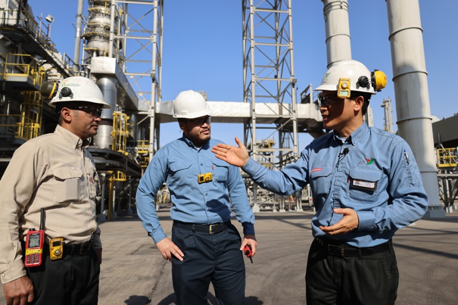 2022年11月27日,在沙特西部城市延布,中沙延布煉廠的員工在交流??偼顿Y86億美元的中沙延布煉廠是中國石化與沙特阿拉伯石油公司合資興建的項(xiàng)目,自2016年1月20日由兩國元首共同啟動投產(chǎn)以來,發(fā)展迅速。今年1月至8月累計實(shí)現(xiàn)利潤11.5億美元。