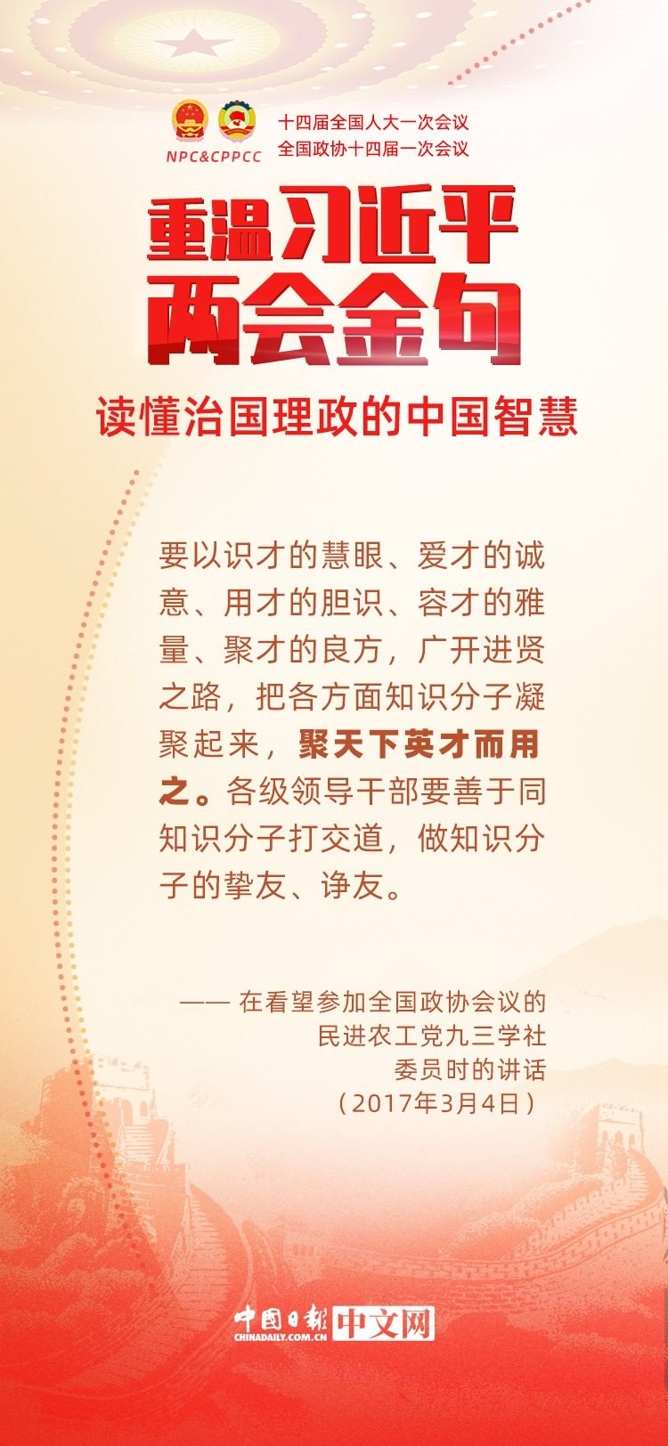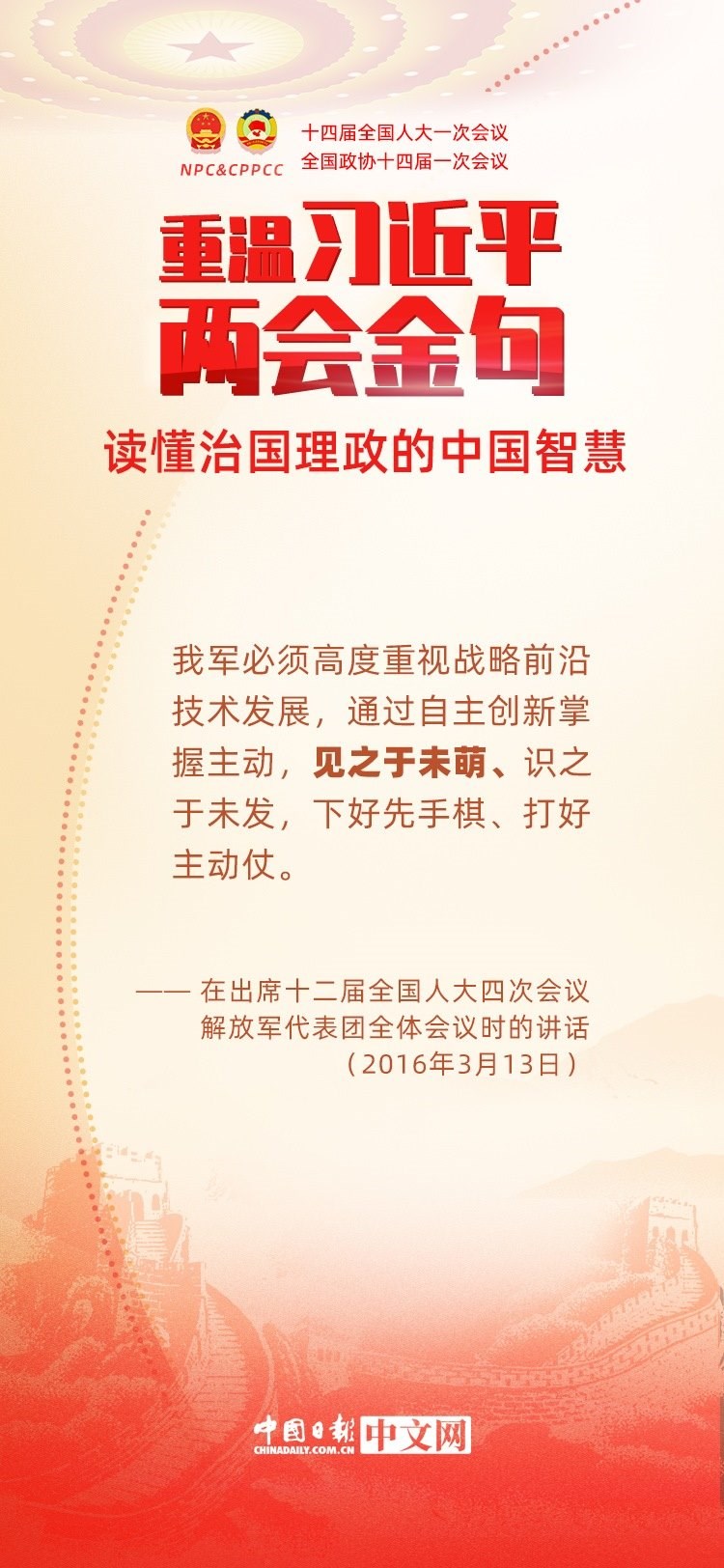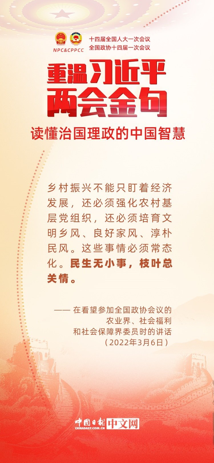 黨的十八大以來,每年兩會期間,習(xí)近平總書記都要與代表委員共商國是。十年來,在一系列重要論述中,習(xí)近平總書記使用詩詞、古語等典故,把中華優(yōu)秀傳統(tǒng)文化融入治國理政的理論和實踐中。
