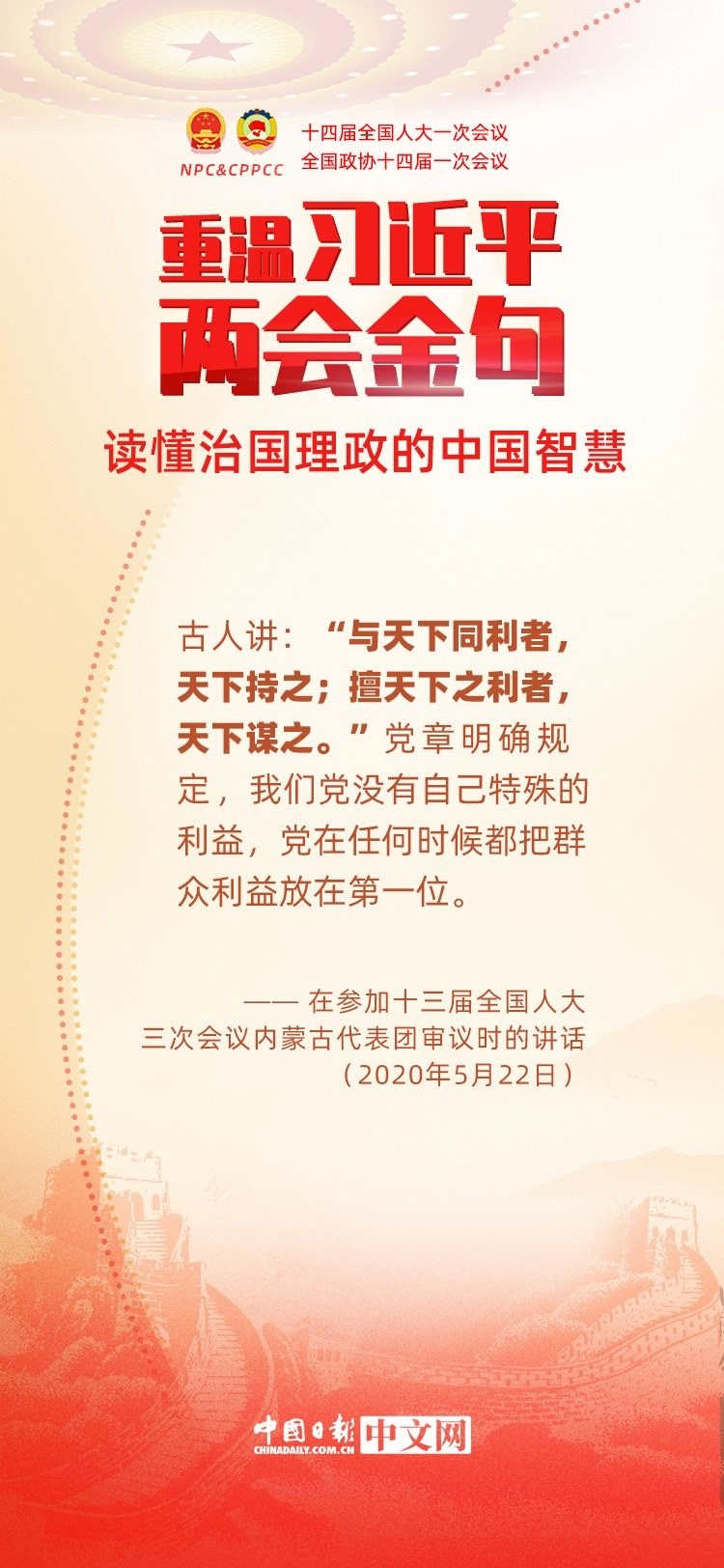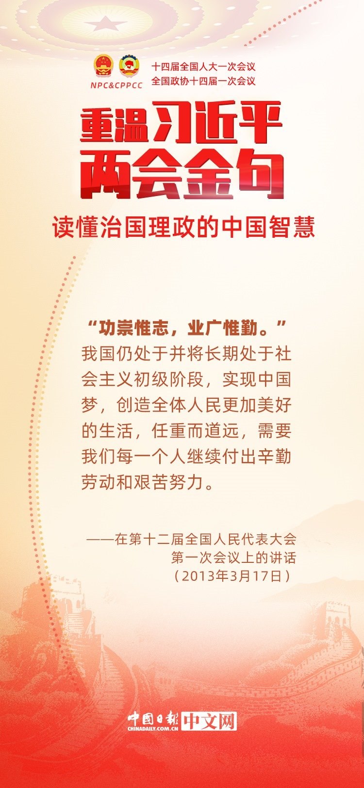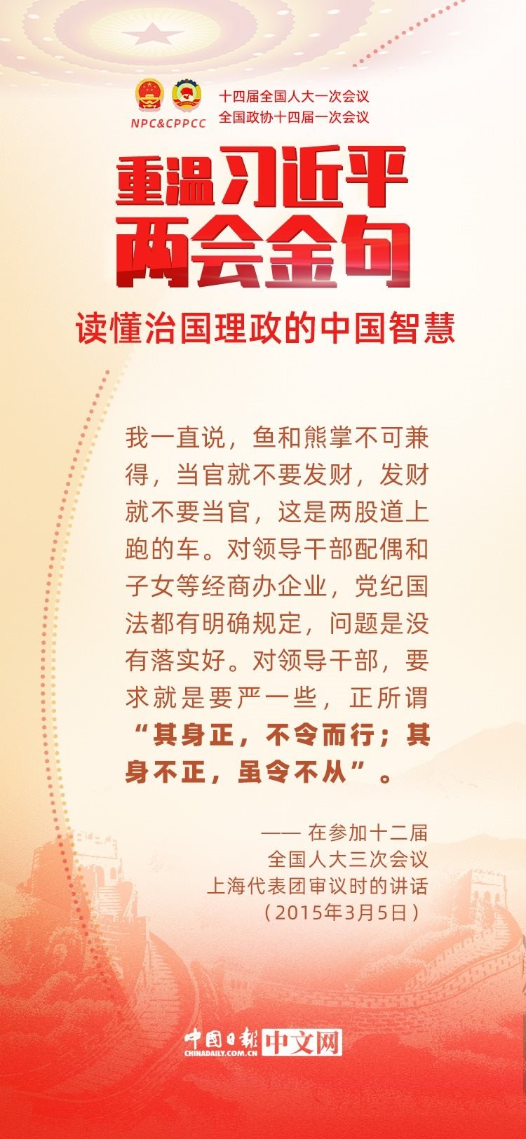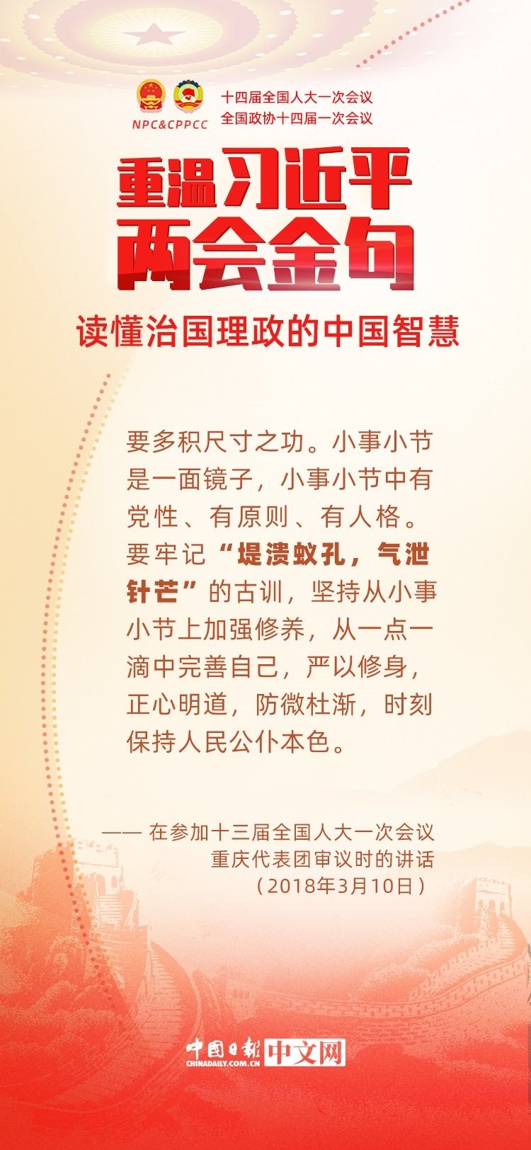 黨的十八大以來,每年兩會期間,習(xí)近平總書記都要與代表委員共商國是。十年來,在一系列重要論述中,習(xí)近平總書記使用詩詞、古語等典故,把中華優(yōu)秀傳統(tǒng)文化融入治國理政的理論和實踐中。