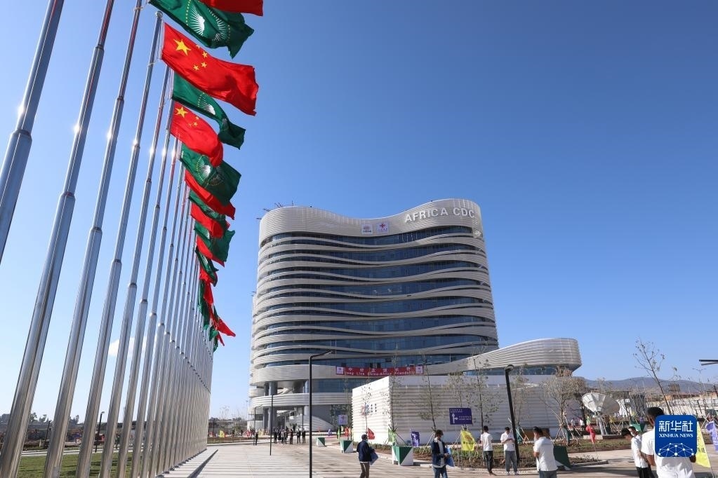 2023年1月11日,埃塞俄比亞首都亞的斯亞貝巴南郊,五星紅旗和非盟會旗迎風(fēng)飄展,中國援非盟非洲疾控中心總部(一期)項目竣工儀式在這里舉行。