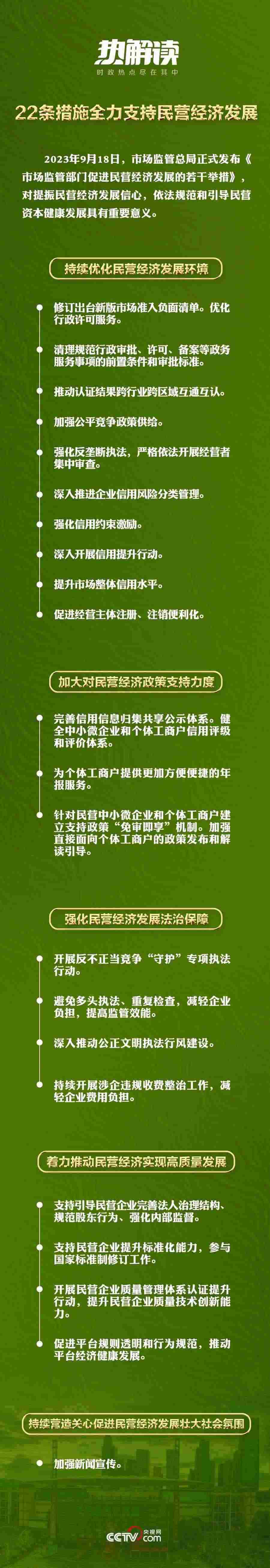 2023年7月14日,中共中央國(guó)務(wù)院出臺(tái)《關(guān)于促進(jìn)民營(yíng)經(jīng)濟(jì)發(fā)展壯大的意見(jiàn)》,對(duì)促進(jìn)民營(yíng)經(jīng)濟(jì)發(fā)展壯大作出新的重大部署。2023年9月18日,市場(chǎng)監(jiān)管總局發(fā)布《市場(chǎng)監(jiān)管部門(mén)促進(jìn)民營(yíng)經(jīng)濟(jì)發(fā)展的若干舉措》,通過(guò)22條措施為全力支持民營(yíng)經(jīng)濟(jì)發(fā)展設(shè)計(jì)了具體落實(shí)的“施工圖”。