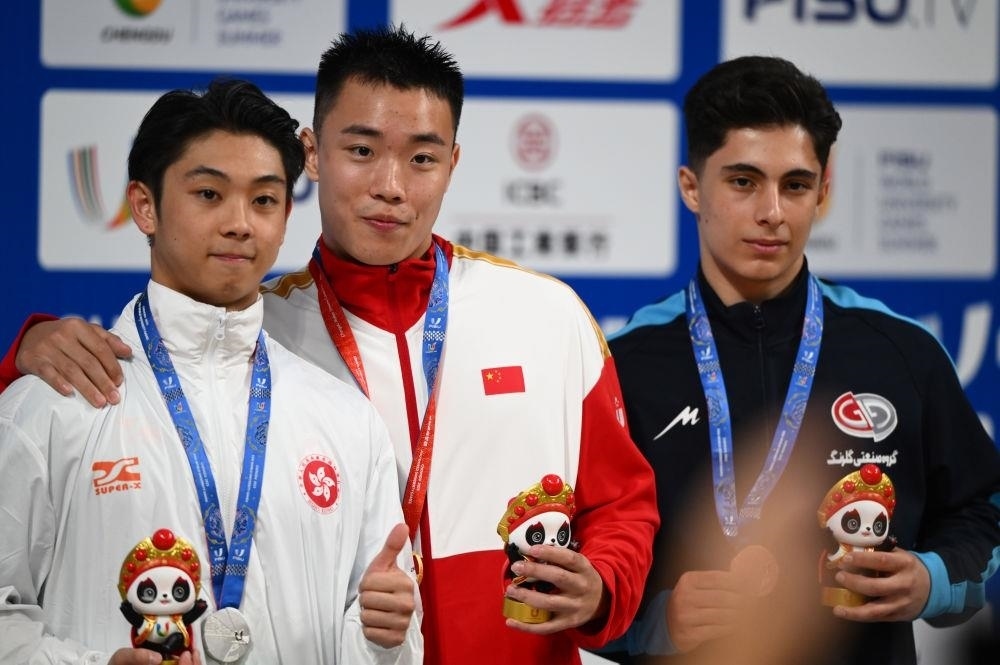 △2023年7月29日,成都大運(yùn)會(huì)武術(shù)項(xiàng)目男子南拳冠軍中國(guó)隊(duì)選手曹茂園(中)、亞軍中國(guó)香港隊(duì)選手劉子龍(左)和季軍伊朗隊(duì)選手巴尼塔勒比在頒獎(jiǎng)儀式上。