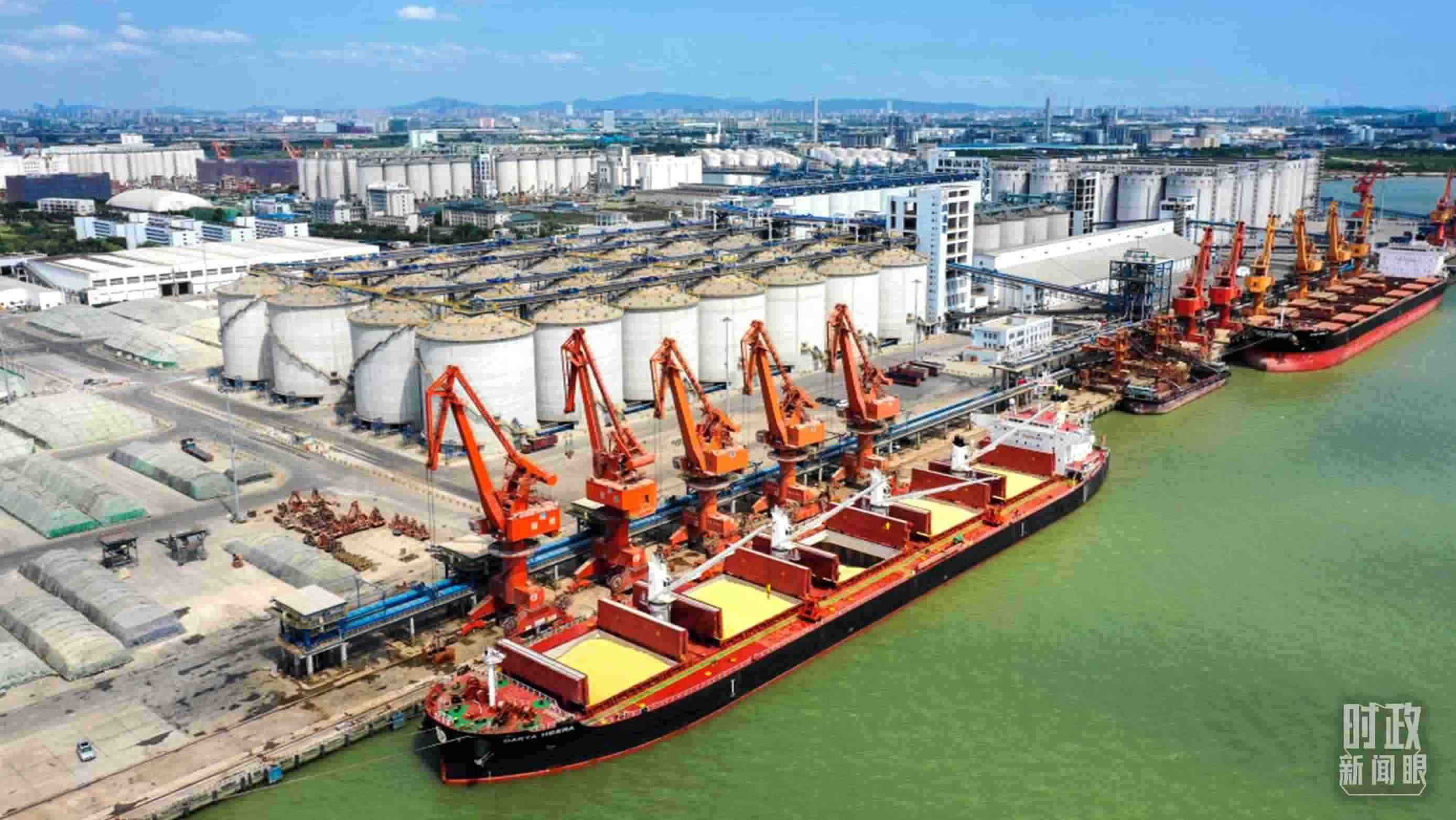 △從南非進口的首船飼料玉米靠泊中國廣東麻涌港。(資料圖)