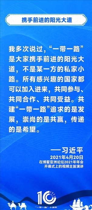 10年前,習(xí)近平主席提出共建“絲綢之路經(jīng)濟(jì)帶”和“21世紀(jì)海上絲綢之路”,即共建“一帶一路”倡議。過去10年來,習(xí)近平主席在多個場合發(fā)表講話和署名文章,為世界描繪了共建“一帶一路”互聯(lián)互通、合作共贏的宏偉藍(lán)圖。