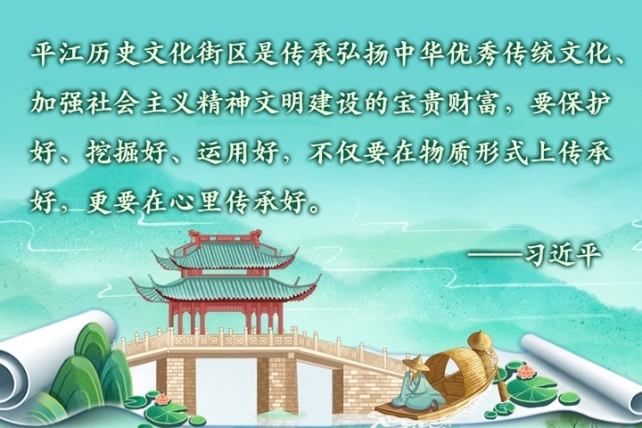2023年7月6日上午,習(xí)近平總書(shū)記來(lái)到位于蘇州古城東北隅的平江歷史文化街區(qū)考察調(diào)研。他說(shuō):“住在這里很有福氣,古色古香,到處都是古跡、到處都是名勝、到處都是文化。‘百步之內(nèi),必有芳草’,這句話可以用在這里?!?/p>