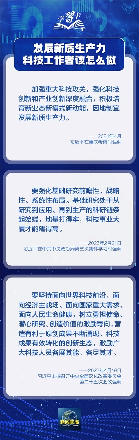 2024年5月30日是第八個“全國科技工作者日”。實現(xiàn)科技自立自強、建設(shè)世界科技強國,廣大科技工作者責(zé)任重大、使命光榮。培育發(fā)展新質(zhì)生產(chǎn)力的新動能,廣大科技工作者可以怎么做?習(xí)近平總書記的一系列論述指明了方向。一起學(xué)習(xí)↓↓↓