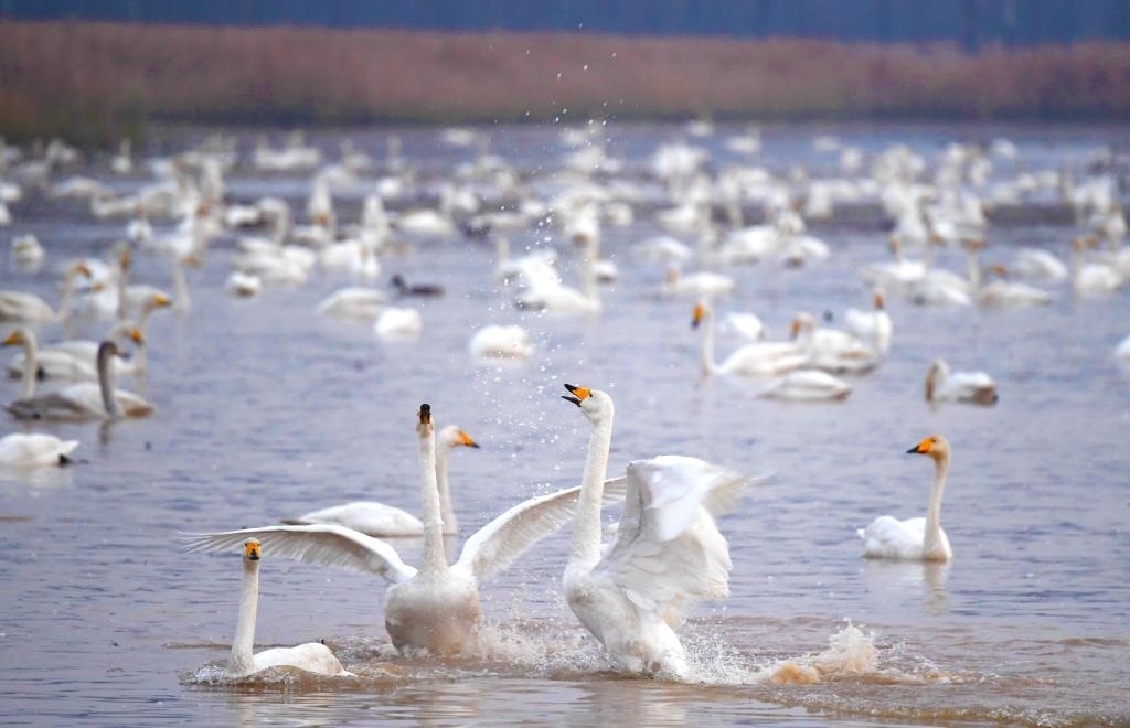 白天鵝在河南三門峽黃河濕地嬉戲。新華社記者 郝源 攝