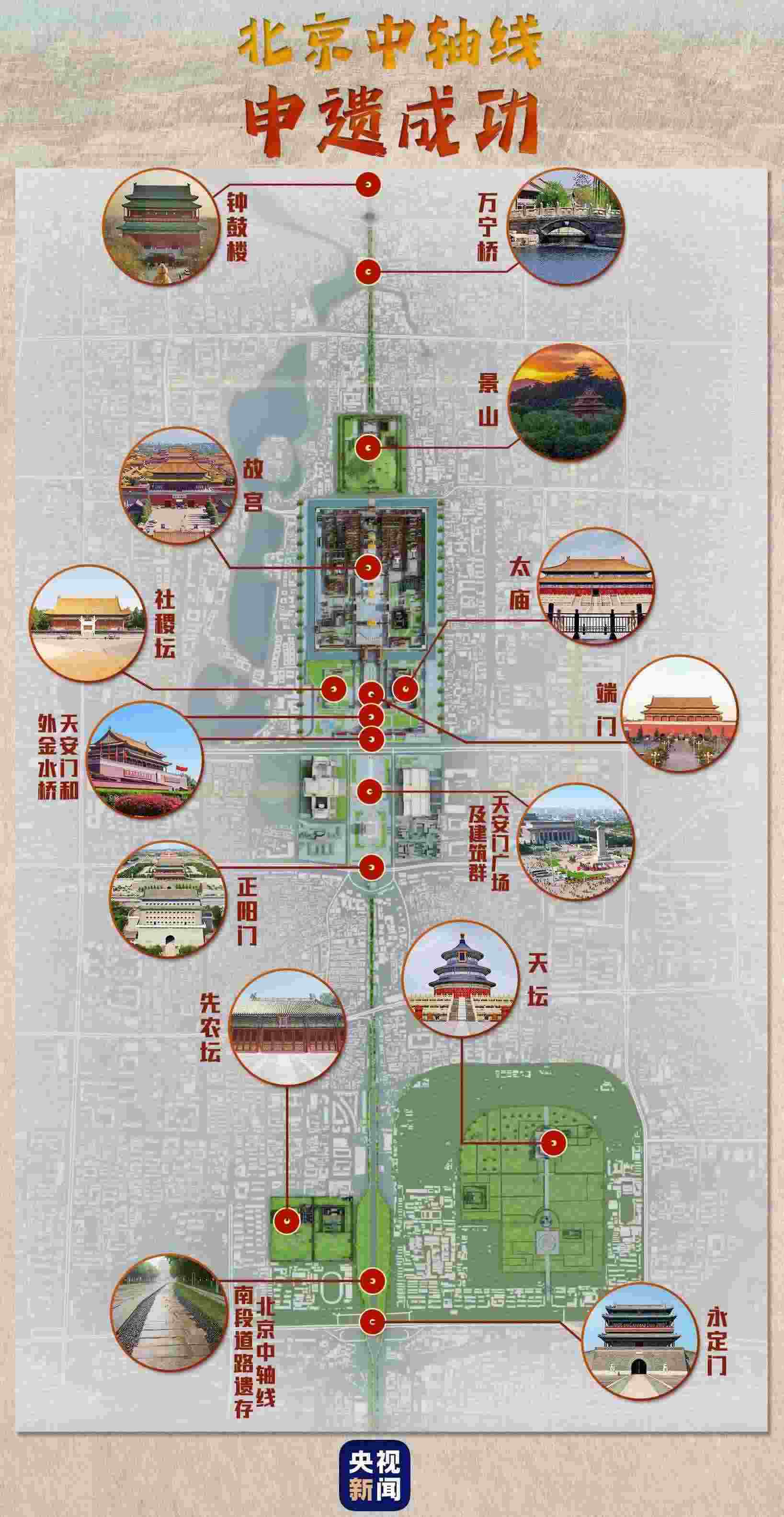 這條中軸線,包含著15處遺產構成要素,前后起伏、左右均衡對稱,是我國“面朝后市”“左祖右社”的傳統(tǒng)都城理想范式,表達了中國傳統(tǒng)都城規(guī)劃對于禮儀和秩序的強調,見證了中國的歷史變革,是國家禮儀文化與傳統(tǒng)城市管理方式的有力物質見證。