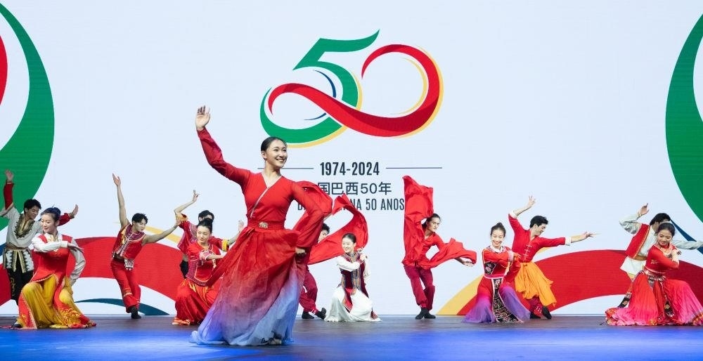 △當(dāng)?shù)貢r間2024年8月15日,在巴西首都巴西利亞,來自北京舞蹈學(xué)院民族舞團(tuán)的演員在慶祝中巴建交50周年招待會上表演。