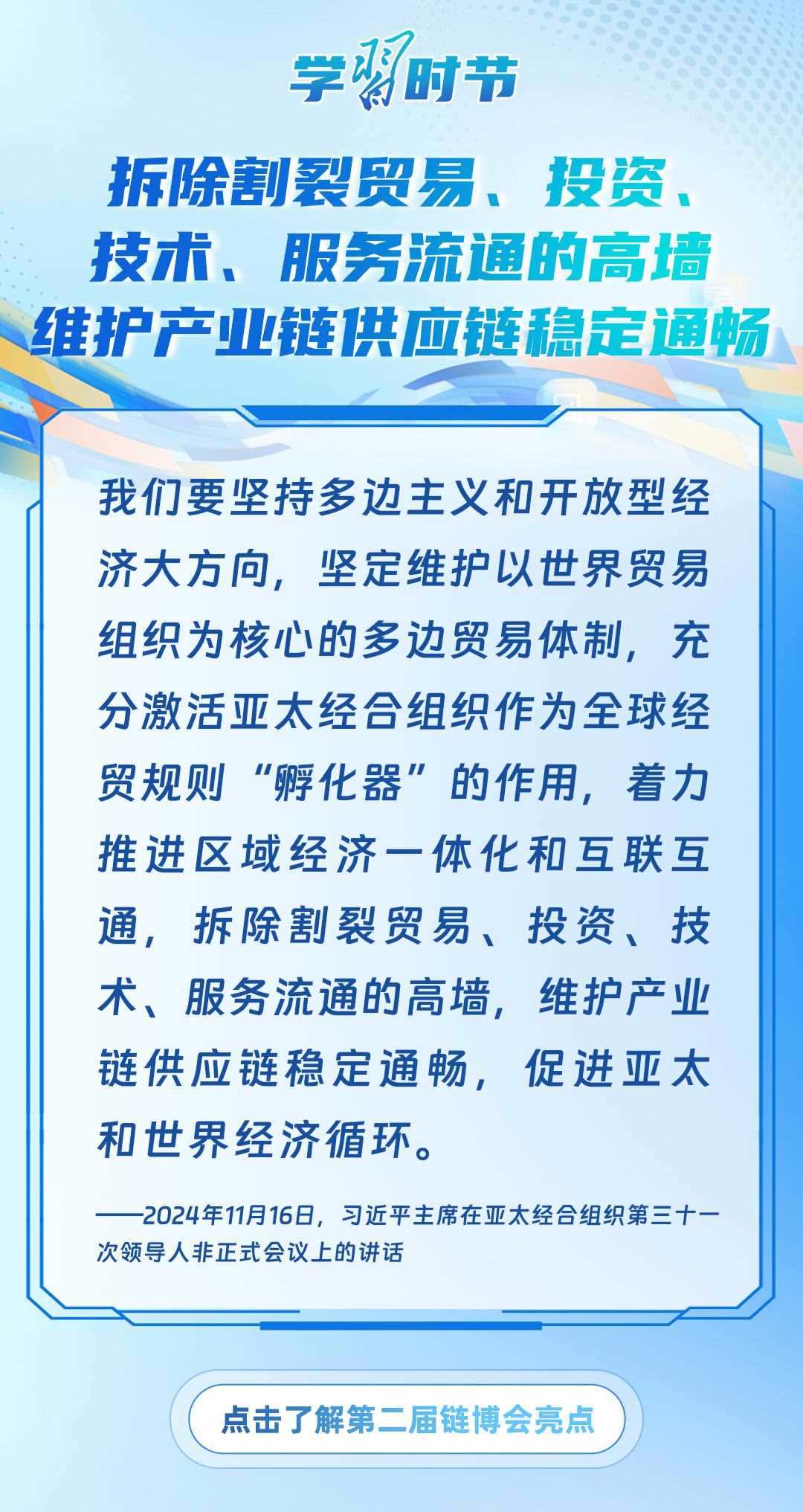 習(xí)近平主席心系產(chǎn)業(yè)鏈供應(yīng)鏈安全穩(wěn)定,多次強調(diào)中國將以實際行動維護全球產(chǎn)業(yè)鏈供應(yīng)鏈安全穩(wěn)定,為世界各國共同構(gòu)筑安全穩(wěn)定、暢通高效、開放包容、互利共贏的全球產(chǎn)業(yè)鏈供應(yīng)鏈體系提供中國方案。習(xí)近平主席曾在多個重要場合對此作出一系列深刻闡述,讓我們一起學(xué)習(xí)。