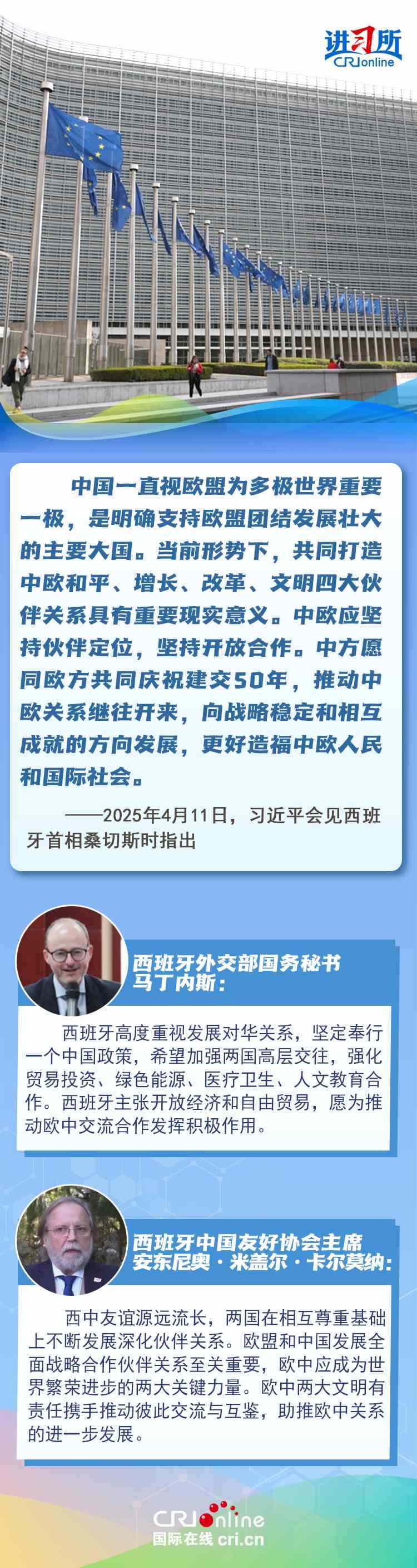 今年是中西全面戰(zhàn)略伙伴關(guān)系建立20周年,也是中歐建交50周年。多年來,中西兩國領(lǐng)導(dǎo)人保持密切互動(dòng),秉持互尊互信、互利共贏精神,兩國在深化貿(mào)易、投資、科技創(chuàng)新、綠色能源等領(lǐng)域取得豐富合作成果,雙邊關(guān)系走在中國同歐洲國家關(guān)系前列。在西班牙人士眼中,良好的對華關(guān)系對西班牙、歐洲和世界具有重要意義,將會(huì)為兩國人民帶來更多實(shí)實(shí)在在的福祉,也將共同創(chuàng)造更美好的未來。