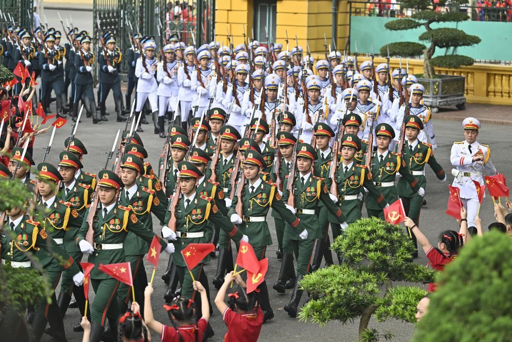 當?shù)貢r間4月14日,中共中央總書記、國家主席習近平在河內出席越共中央總書記蘇林舉行的歡迎儀式。