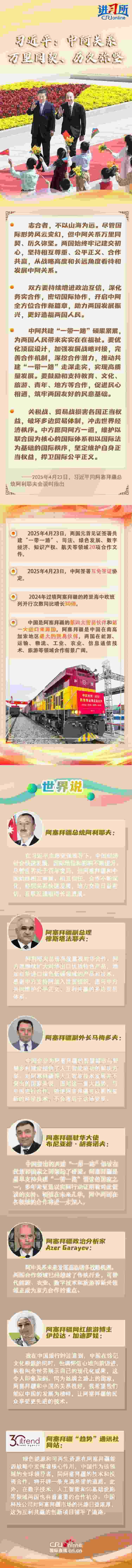 4月23日,中國國家主席習近平在北京同阿塞拜疆總統(tǒng)阿利耶夫舉行會談。兩國元首宣布,建立中阿全面戰(zhàn)略伙伴關(guān)系。習近平指出,盡管國際形勢風云變幻,但中阿關(guān)系萬里同契、歷久彌堅。雙方要持續(xù)增進政治互信,深化務(wù)實合作,密切國際協(xié)作,開啟中阿全方位合作新篇章,助力兩國發(fā)展振興,更好造福兩國人民。