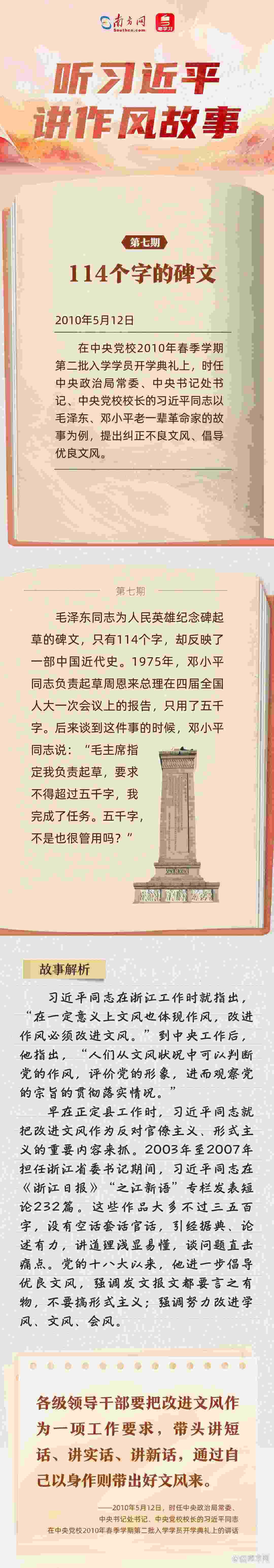 當前,全黨上下正在開展深入貫徹中央八項規(guī)定精神學習教育,縱深推進作風建設。關于作風建設,習近平總書記常用講故事的方式,傳達深意、感染他人,給人以思想啟迪。南方網、粵學習客戶端推出“聽習近平講作風故事”系列報道,與您一起感悟這些故事蘊含的深刻道理。 今天,推出《聽習近平講作風故事⑦丨114個字的碑文》,與您一起學習毛澤東、鄧小平老一輩革命家的文風。