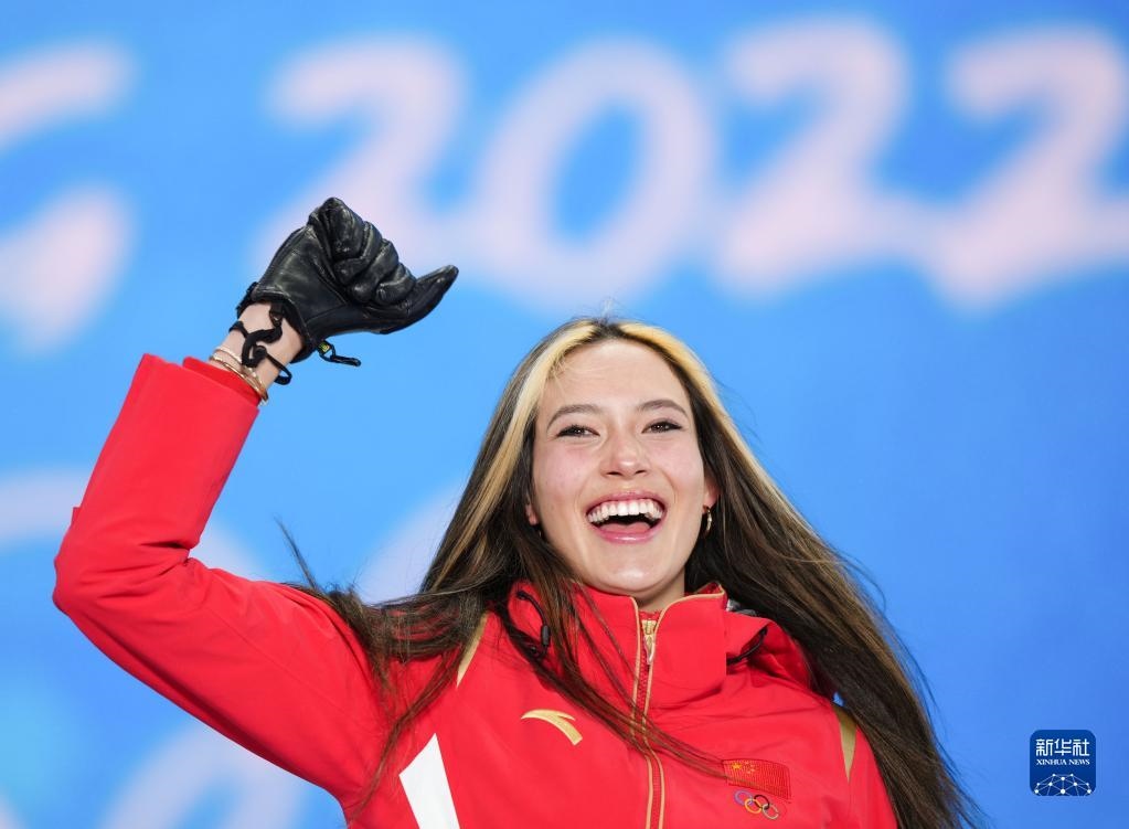 2月18日,冠軍中國隊選手谷愛凌在自由式滑雪女子U型場地技巧獎牌頒發(fā)儀式上。新華社記者薛玉斌攝