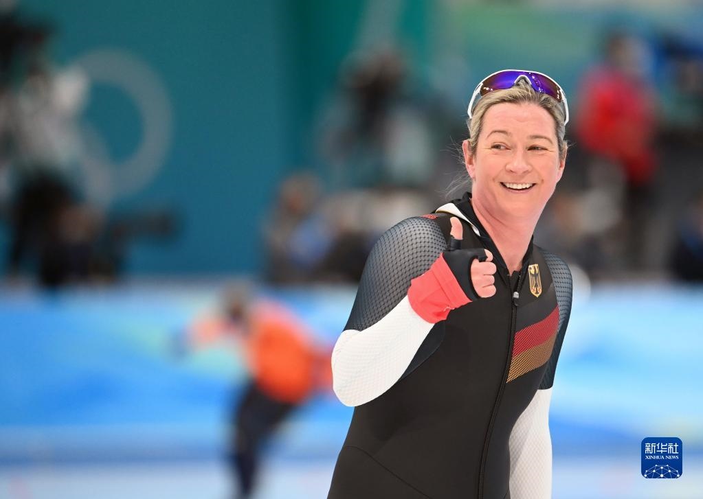 2月5日,德國隊選手克勞迪婭·佩希施泰因在速度滑冰女子3000米決賽后。新華社記者武巍攝