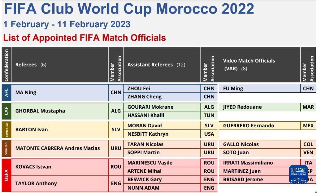 新華社北京1月15日電 國際足聯(lián)15日在官網(wǎng)公布2022摩洛哥世俱杯執(zhí)法裁判員名單,國際級裁判員馬寧、傅明和國際級助理裁判員周飛、張鋮入選。這將是中國裁判員首次執(zhí)法該項國際足聯(lián)頂級賽事。