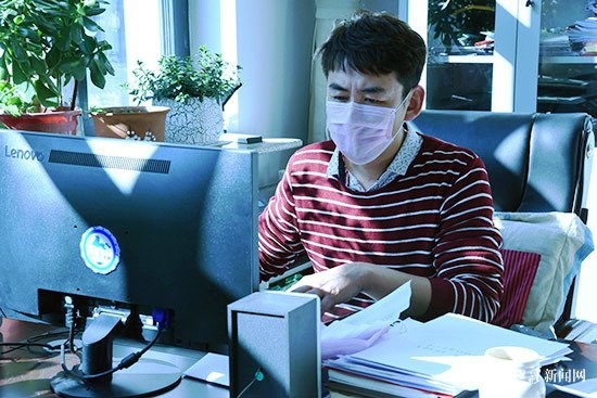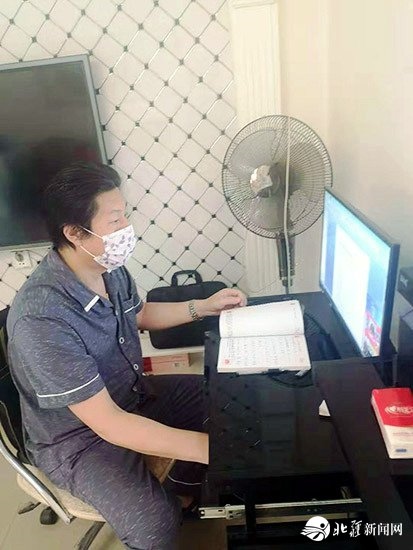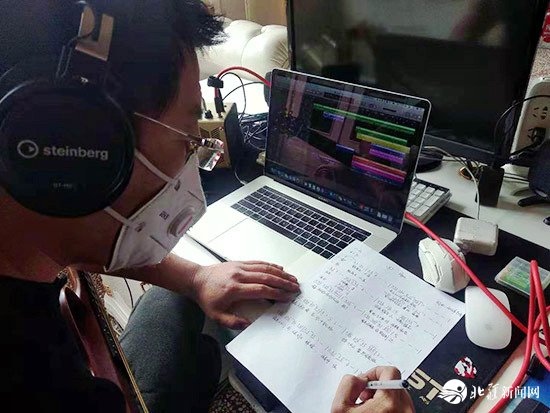 喀喇沁旗烏蘭牧騎隊(duì)長(zhǎng)吳國輝在家中創(chuàng)作快板作品《為逆行者點(diǎn)贊》。受訪者供圖