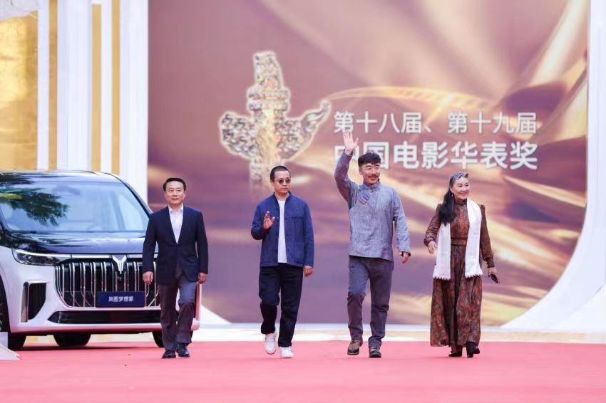 呼和巴特爾(左一)和《片警寶音》劇組成員登上了華表獎(jiǎng)?lì)I(lǐng)獎(jiǎng)臺(tái)