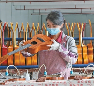 正安吉他文化產(chǎn)業(yè)園內(nèi),企業(yè)工人在制作樂器。趙永章攝
