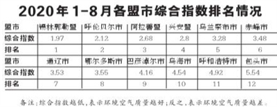 2020年1-8月,全區(qū)環(huán)境空氣質量達標天數比例平均為88.6%。12個盟市達標天數比例由高至低依次為:呼倫貝爾市(100.0%)、錫林郭勒盟(98.8%)、興安盟(95.9%)、赤峰市(93.4%)、烏蘭察布市(93.4%)、阿拉善盟(92.6%)、鄂爾多斯市(88.5%)、通遼市(88.1%)、巴彥淖爾市(81.0%)、烏海市(79.1%)、包頭市(76.2%)和呼和浩特市(76.2%)。