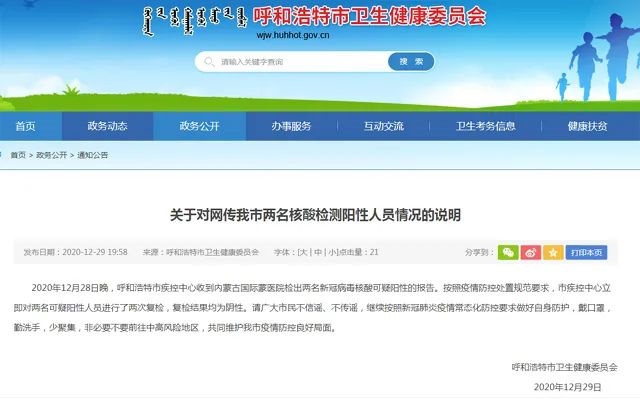2020年12月28日晚,呼和浩特市疾控中心收到內(nèi)蒙古國際蒙醫(yī)院檢出兩名新冠病毒核酸可疑陽性的報告。按照疫情防控處置規(guī)范要求,市疾控中心立即對兩名可疑陽性人員進(jìn)行了兩次復(fù)檢,復(fù)檢結(jié)果均為陰性。請廣大市民不信謠、不傳謠,繼續(xù)按照新冠肺炎疫情常態(tài)化防控要求做好自身防護(hù),戴口罩,勤洗手,少聚集,非必要不要前往中高風(fēng)險地區(qū),共同維護(hù)我市疫情防控良好局面。
