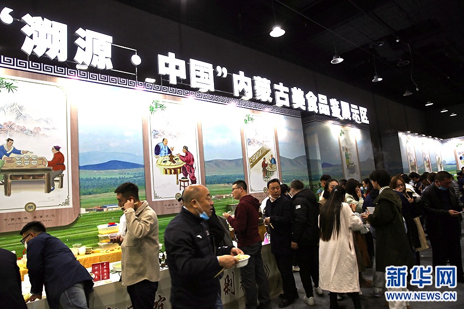 “溯源中國(guó)”內(nèi)蒙古美食品鑒展示區(qū)里,觀眾品鑒內(nèi)蒙古美食。新華網(wǎng) 石毅 攝